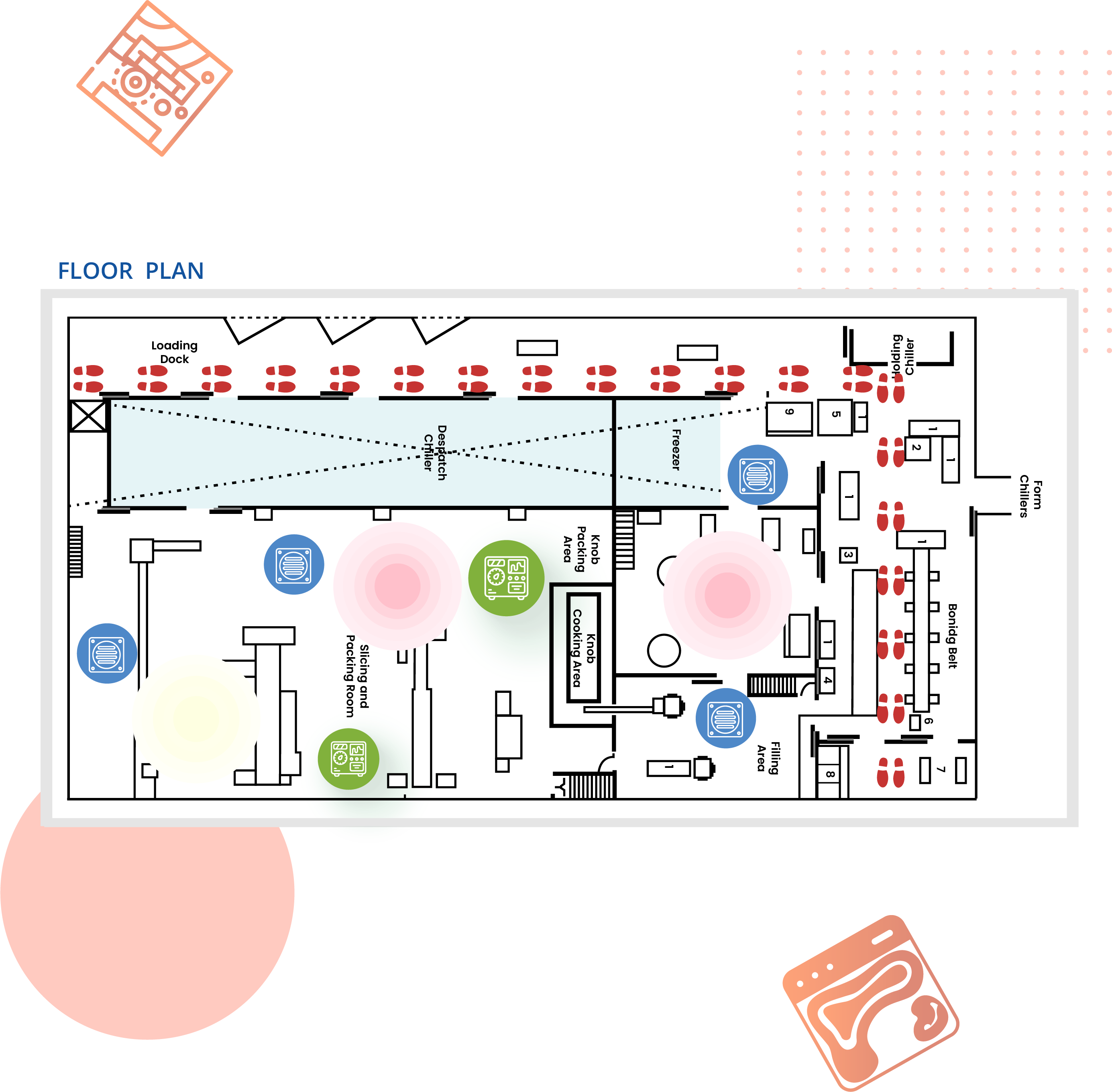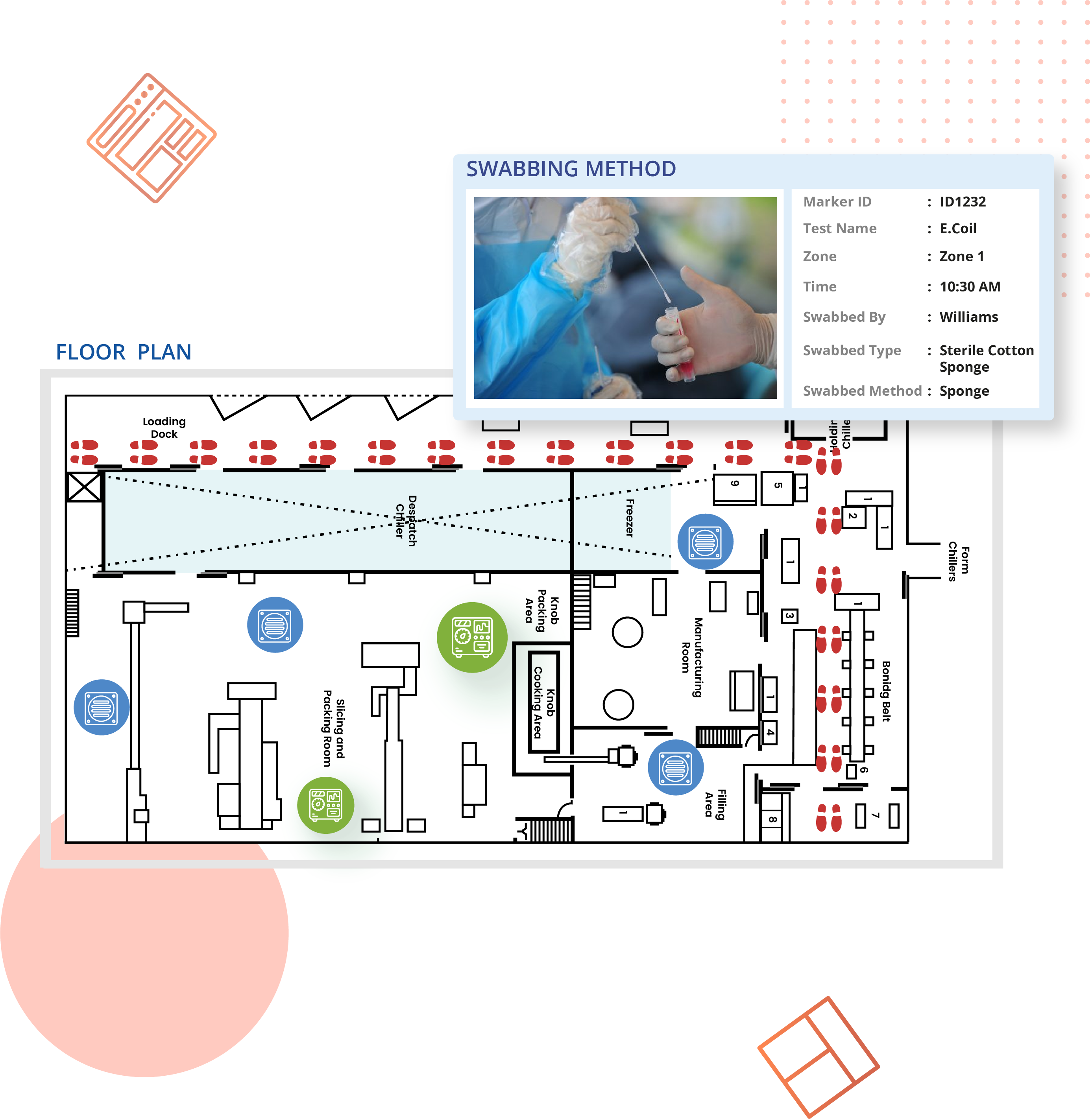 The digital plant layout will give the users a visual representation of the swabbing zones. Users can also place equipment, drains and traffic flow inside the floor layout to easily identify the swabbing locations.